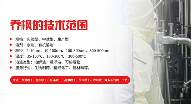 上海喬楓實業有限公司,成立于2012年,是從事噴霧干燥設備的研發設計、生產、銷售(小型噴霧干燥機實驗型噴霧干燥機,35℃低溫噴霧干燥機有機溶劑噴霧干燥機,低溫閉式循環噴霧干燥機超細粉末噴霧干燥機、噴霧冷凍干燥機真空噴霧干燥機、氣流噴霧干燥機噴霧造粒干燥機,離心噴霧干燥機,沸騰制粒機等)和售后于一體的綜合性公司,本公司現成為一家致力于為生物制藥、精細化工、新能源、陶瓷造粒及食品工程等領域提供全套解決方案的整線交鑰匙工程企業。